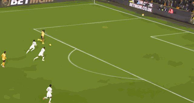第48分鐘,黃喜燦完成攔截,給阿羅科達(dá)雷送出直塞。阿羅科達(dá)雷單刀推射遠(yuǎn)角得手。狼隊(duì)1比3扳回一城。